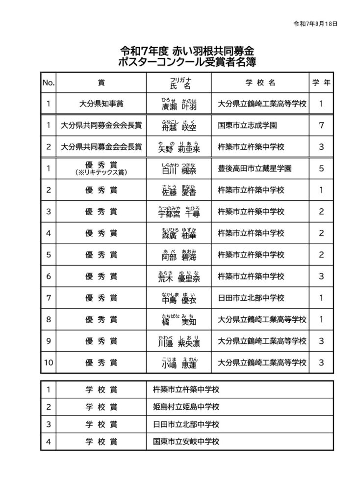令和7年度赤い羽根共同募金ポスターコンクール入賞者